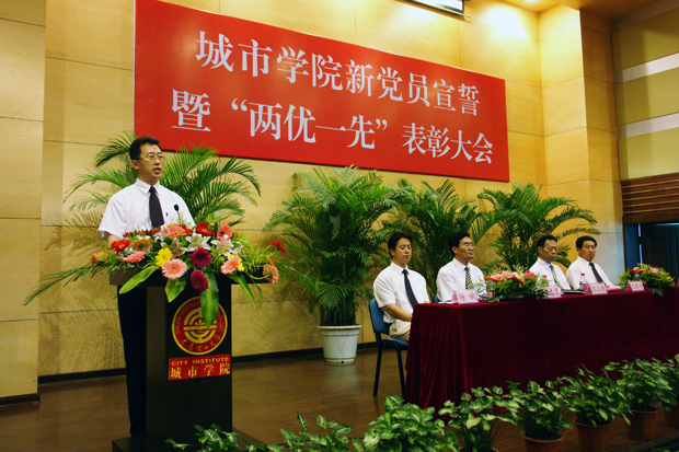 表彰大会由院党委副书记、副院长杨斌主持,在雄壮的国歌结束后,121名教工和学生新党员在鲜艳的党旗下庄严宣誓,从此成为伟大的中国共产党的光荣一员。